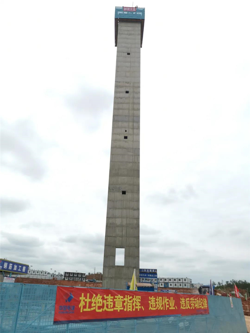 烟囱作为兴国县生活垃圾焚烧发电项目第二个结构封顶的单位工程,属于超过一定规模的分部分项工程,建设过程中采用液压翻模技术,自基础翻模浇筑至筒顶,外筒采用钢筋混凝土剪力墙,内筒钢结构,总高度为79.8m。